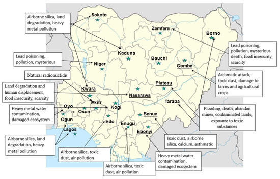 The sources of hazards associated with the sector include chemical, physical, and mechanical [21,45,46,47,48,49,50,51,52,53]. Major mining accidents occur due to the use of crude and sharp tools by artisanal and small-scale miners to extract minerals. Some of past and current mining hazards or accidents in different parts of Nigeria are shown in Table 2 and Figure 3. These hazards are traceable to the illegal mining and mineral extraction practices done by artisanal miners in Nigeria. Stone quarrying and solid minerals exploration dominate artisanal and small-scale mining (ASM) activities in Nigeria [45], as shown in Table 2 and Figure 3.