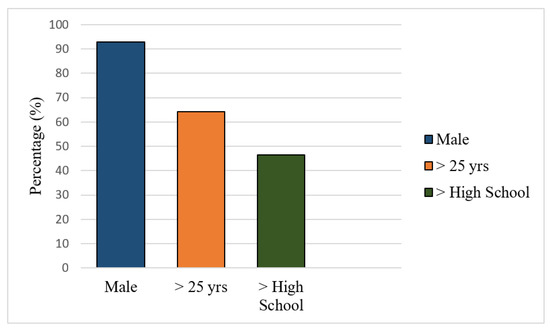 The survey results shown in Figure 4 agree that artisanal barite mining is dominated by men (mostly young adults) and has a lower literacy level as reported on the general status of artisanal and small-scale mining (ASM) in Nigeria. Previous research has shown that artisanal miners of gold, gemstones, diamond, galena, limestone, zinc have similar gender distribution and are exposed to peculiar risks and difficult tasks associated with their profession. Miners are predominantly unskilled and semi-skilled, as observed with artisanal miners that specialize in gold, gemstone, granite, and sand mining. This agrees with the general state of several mining sites managed by artisanal and small-scale miners in Nigeria [19,74,75,76,77,78].
