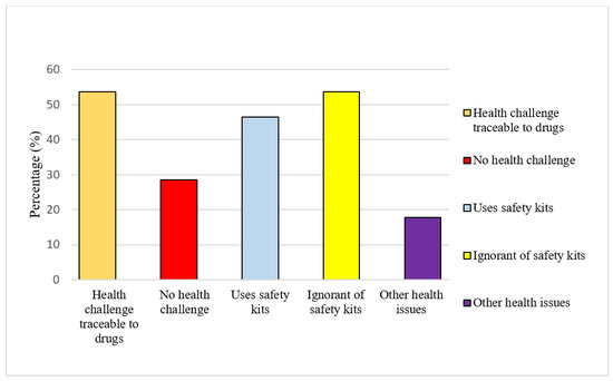 Part of the survey sought to know the previous and present health challenges of miners within the barite field under the study. Figure 5 shows that ~54% of the miners that responded to the survey agreed they have health challenges traceable to illicit drug intake such as stimulants; 17.9% of the respondents had experienced specific symptoms such as headache, stomach-ache, body weakness, and difficulty breathing. Such health issues may be traceable to rigorous mining activities and exposure to poisonous substances [72,73]. In comparison, 28.7% argued that they do not have any health issues. Also, 53.6% of the miners were ignorant of the benefits of using safety kits for mining, while 46.4% of the miners use safety kits but not at all times. Mine workers were exposed to certain risks, either knowingly or ignorantly, and become most vulnerable to sickness, air-borne diseases, and perhaps death because of insufficient knowledge about the risks associated with the mining profession.