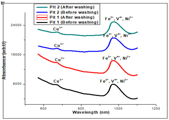 UV-Vis spectrograph for the elemental composition of water from the mined pits (UV-visible spectra of transition metals complexes identified in the water samples showing weak d-d absorbance bands at 675 nm and is assigned to Cu2+, and absorption bands that stretch from 960 to 980 nm posted to Fe2+, V4+, and Ni2+, respectively).