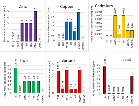 The inductively coupled plasma mass spectroscopy (ICP-MS) results in Figure 7 shows that zinc, copper, and cadmium are below the maximum allowable limit set by World Health Organization (WHO), European Union (EU), Nigerian Industrial Standards (NIS), United States Environmental Protection Agency (USEPA), and China Ministry of Health National Standards (CMHNS) for ecological and health safety. However, the content of Fe in TB1 is relatively higher than the maximum allowable limits set by the governing standards. Similarly, Pb in TB1 is above the health and environmental risk levels recommended by the local and international agencies. This outcome indicates that the water used in the ore washing will result in water pollution and heavy metals’ ingestion if returned to rivers and streams used by people. On the contrary, there was no evidence of cadmium contamination in the digestates of mine tailings or tailing effluents in the current study, as shown in Figure 7.