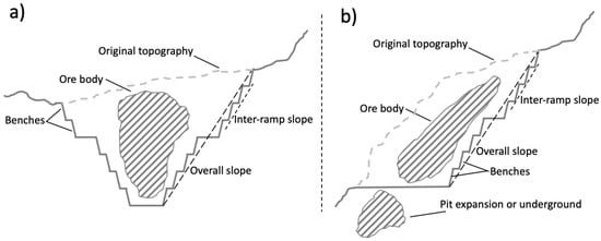 Cross section sketches of typical open pit configurations (a) and pit walls on the side of steep slopes (b). Not to scale.