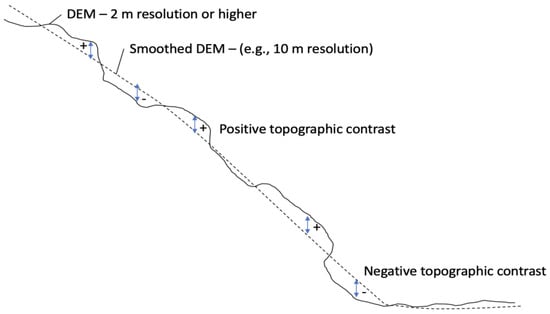 Illustration of topographic contrast and identification by comparing detailed and smoothed digital elevation models (DEMs).