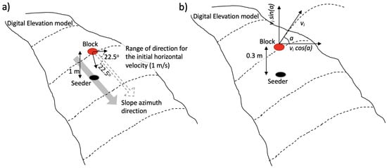 At a feasibility level, Rn = 0.35 and Rt = 0.75, could be considered as these are consistent with values reported in the literature. These values are the mid-range expected values from calibration studies in the technical literature. Rockfalls originated by natural processes can be modelled with seeders 1 m above the topographic surface, with an initial velocity of 1 m/s, and with an aleatory direction within +/−22.5° from the slope azimuth at the location of the seeder. This is consistent with the approaches in the literature and aim at modelling initial block detachment motion. This is illustrated in Figure 4a. Modelled trajectories culminate when the translational velocity becomes less than 0.1 mm/s.