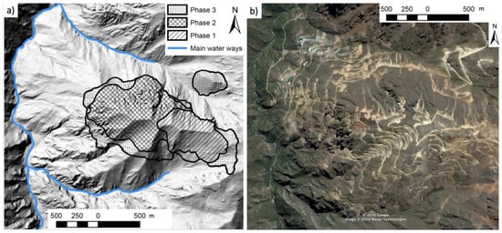 Layout of the three phases of the pit and main waterways (a) and aerial view of the same scene (b) (©Google Earth, retrieved in 2020, Image © Maxar Technologies 2014).