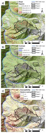 Several approaches for rockfall susceptibility mapping have been proposed, including those in [9,10,11,12,13,14]. Most approaches focus on topographic characteristics (e.g., [10,13]), with others highlight the effect of rock mass quality and structure (e.g., [14]). The approach developed here uses topographic characteristics, following [8], and it is suggested that the effect of rock mass quality and structure in rockfall likelihood can be complementary once the critical rockfall sources (those that could reach the elements of interest) are identified. This sequence optimizes the resources available for detailed field investigation for rockfall potential and is consistent with the other methods referenced. The rockfall susceptibility can be calculated following Equation (1) (this study), however the approaches described in the above references can also be adopted. All these have shown to provide adequate susceptibility maps through published calibration.