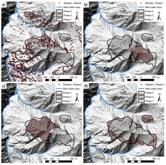 The location of seeders for the rockfall trajectory models originated from natural processes were calculated by transforming the susceptibility raster map to points with an attribute that corresponded to the susceptibility values (ArcGIS toolbox). Points were classified according to the susceptibility attribute and those with the lower susceptibility were eliminated (ArcGIS editing capabilities within the attribute tables for shape files). A manual check was performed to verify that high susceptible areas had corresponding seeder locations. The seeders for naturally occurring rockfalls are shown in Figure 7a. Seeders for trajectory models corresponding to the different phases of the pit are shown in Figure 7b–d; and are placed within the corresponding layout for each phase.