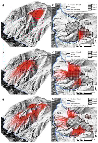 Figure 9b shows that initial operations in the south west section of Phase 1 have the potential to impact the upper reach in Sector 3. This suggests that the area would require some mitigation prior to initiating activities. During the initial stage of Phase 2, all three sectors are impacted. It is interest to note that although sector 1 appears to be impacted ubiquitously, trajectories towards sectors 2 and 3 follow preferential paths. This opens an opportunity to target these preferential paths in order to optimize the efficiency of resource allocation for rockfall mitigation (Figure 9d). Initial operations in Phase 3 show a more ubiquitous impact in Sector 3; however, the impact in Sector 2 is localized and similar to that during Phase 2 (Figure 9f).