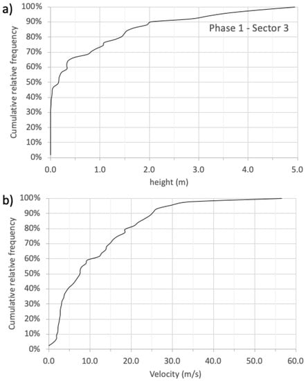 Cumulative relative frequency of heights (a) and velocities (b) for Phase 1 trajectories reaching Sector 3.