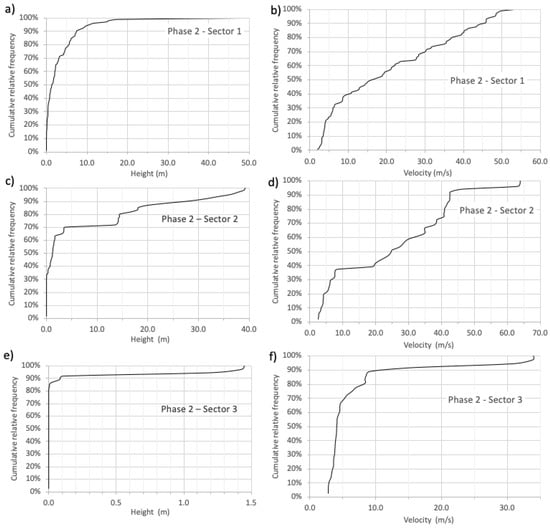 Cumulative relative frequency of heights (left) and velocities (right) for Phase 2 trajectories reaching Sector 1 (a,b), Sector 2 (c,d) and Sector 3 (e,f).