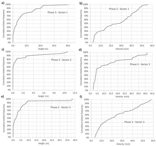 Cumulative relative frequency of heights (left) and velocities (right) for Phase 3 trajectories reaching Sector 1 (a,b), Sector 2 (c,d) and Sector 3 (e,f).