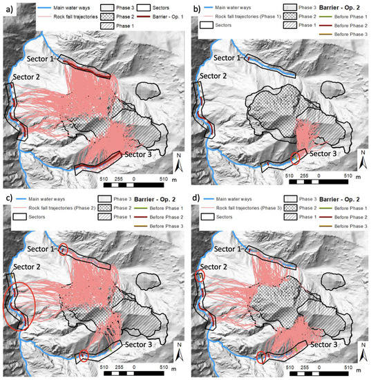 Proposed layout of rockfall protection for Option 1 (a) and Option 2. Trajectories reaching the different sectors are plotted for Phases 1 (b) 2 (c) and 3 (d) to illustrate the required sequence of installation.