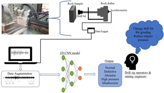 Figure 1 shows the proposed drill bit failure detection system design. The system comprises accelerometers installed on the guide cell of the rock drifter to capture vibration signals from drilling. Vibration signals are then used as input to a 1D CNN network. After training and evaluating different models, the best model is then selected as the drill bit failure detection system. The application of this proposed system in the mining site can help drill rig operators and mining engineers identify possible drill bit failures, thereby minimizing mining costs and increasing the productivity of the mine.