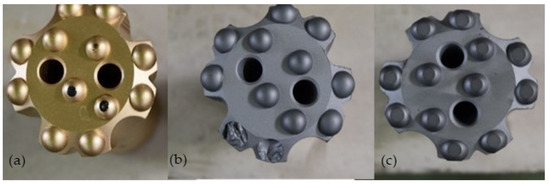 Tungsten carbide drill bits used for drilling: (a) normal bit, (b) chipped button bit (defective), (c) worn-out bit (abrasion).