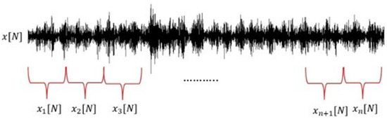 CNNs require a large amount of data for training and testing; hence, data augmentation was performed to increase the number of data sets to improve the accuracy of the CNN model. Sampling frequency, sampling time, and sampling number were taken into consideration for data augmentation. The sampling frequency was set at 50 kHz with a sampling time of 60 s; using Equation (1), each drill hole had approximately 3,000,000 sampling numbers (data points). Each test drill hole signal was divided into approximately 1000 segments each with 3000 data points with no overlapping. Figure 4 depicts the data augmentation process. Each segmentation had a fixed length of 0.06 s, which guaranteed that at least 3 drill bit hits were represented within one segment. Each drill condition had 9000 test samples to be used for training, validating, and testing the 1D CNN model.