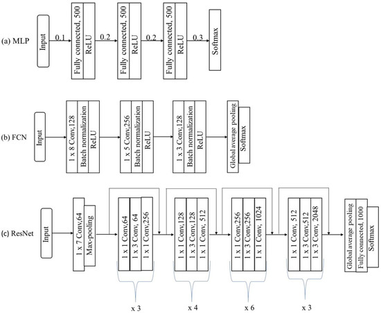 MLPs are the most traditional form of DNNs. They were described as a baseline architecture for time series classification by Wang et al. [21]. The network has four layers; each is fully connected to the output of its previous layer. The three fully connected layers have 500 neurons followed by dropout at each layer’s input, to improve the generalization capability. The rectified linear unit (ReLU) is used as an activation function to prevent saturation of the gradient when the network is deep. The network ends with a softmax layer. The dropout rates at the input layer, hidden layers, and the softmax layer are 0.1, 0.2, and 0.3, respectively, as shown in Figure 5a.