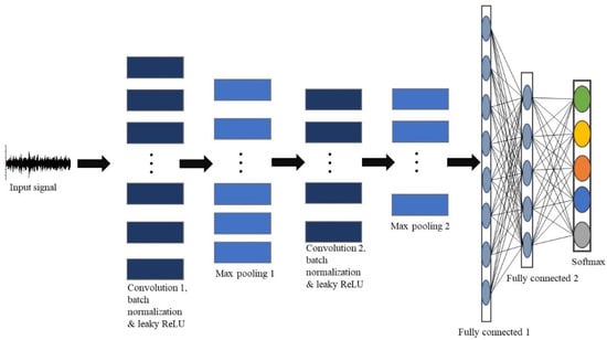 Recent studies show that time series classification 1D CNNs with relatively shallow architectures can learn challenging tasks involving 1D signals [15]; therefore, a simple and compact CNN architecture was constructed. The proposed 1D CNN model was inspired by Time Le-Net (t-LeNet) model, which was originally made famous by Guennec et al. [23]. The t-LeNet model has two convolutional layers, followed by a fully connected layer and a softmax classifier. The model utilizes a local max pooling operation as a way of achieving translation invariance. A similar CNN architecture was adopted, but hyperparameter alterations were made to suit our dataset. The proposed CNN architecture shown in Figure 6 comprises two pairs of convolutional and max pooling layers, two fully connected layers, and a softmax layer. The last fully connected layer combines features to classify signals; therefore, the output size argument of the last fully connected layer is equal to the number of classes of the data set. As shown in Table 4, the first convolutional layer has a kernel size of 751 with 128 filters and a stride of 2. The second convolutional layer has a kernel size of 281 with 128 filters and a stride of 2. Batch normalization and leaky ReLU were applied after each convolutional layer, before max pooling to speed up the convergence and to help improve generalization. The proposed model had a total of 31,515,805 learnable parameters.