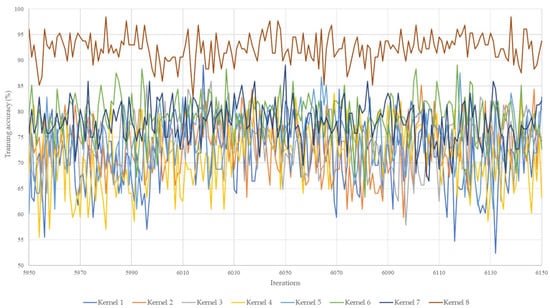 Training accuracy learning curve for all kernel sizes. The Y-axis shows the training accuracy in percentage and the X-axis indicates the iterations from iteration 5950 to 6150.