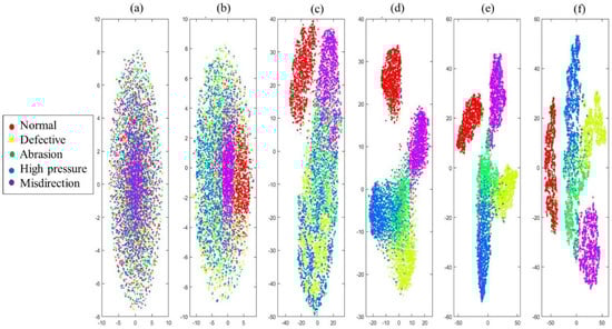 Visualization of the DBFD model’s activations using the t-distributed stochastic neighbor embedding (t-SNE) method. t-SNE was used to visualize clustering as training occurred in (a) convolution 1, (b) max pooling 1, (c) convolution 2, (d) max pooling 2, (e) fully connected layer 1, and (f) the softmax layer of the DBFD 2 model.