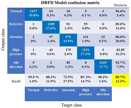 Table 9 summarizes the accuracy and processing time of all four models. Processing time was used to evaluate the computational complexity and processing efficiency of the models. The results demonstrate that in terms of classification accuracy, the proposed model performed better than all three SOTA models. The DBFD model had an overall classification accuracy of 88.7%. ResNet model ranked second with a classification accuracy of 81.6%. FCN ranked third with an accuracy of 76.7%. MLP had the lowest classification accuracy of 54.0%, which indicates that the model could not learn distinct patterns to differentiate the five drilling conditions. Based on the computation time it took each model to make classifications, MLP showed the best performance, by taking the shortest time of 170.52 min for 6150 iterations; this is because it has three fully connected layers, each with 500 neurons; therefore, forward and backpropagation can be carried out swiftly. The proposed DBFD model had the shortest processing time of 428.50 min compared to FCN (476.57 min) and Resnet50 (1805.29 min), which implies a better processing efficiency. Resnet had the longest training time because it is 50 layers deep. Figure 12 shows the confusion matrix of the SOTA models. From Figure 12, it can be noted that normal and misdirection had the highest recall and precision in all models compared to other classes. Across all SOTA models, the most misclassifications occurred between the class pairs of abrasion–high pressure and abrasion–defective. The proposed DBFD model outperforms the SOTA models in terms of classification accuracy and processing efficiency, which makes it superior in predicting drill bit failure in rotary percussion drills.
