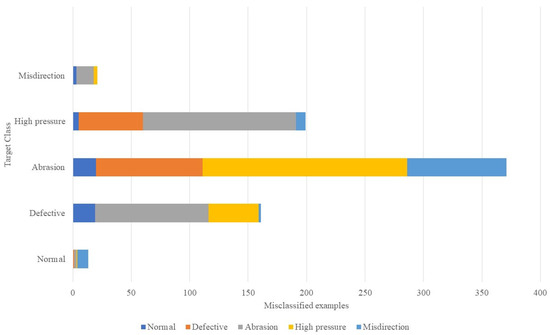 From the confusion matrix in Figure 9, it can be noted that the normal condition had the highest recall of 99.0%; out of 1350 examples, the model was correct for 1337. Misdirection also had a high recall of 98.4%. Defective and high pressure had a recall of 88.1% and 85.3%, respectively. The model had the lowest recall of 72.5% for abrasion; out of 13,500 examples, it predicted 979 correctly and misclassified 371. In terms of precision, normal and misdirection had the highest precisions, of 96.6% and 92.7%. The results indicate that the model was less precise with the abrasion condition, in which a precision of 80% was attained. The model had a good precision rate of ≥80% in all classes. Overall classification accuracy of 88.7% was achieved, which was satisfactory. Figure 10 shows the false negatives for each target class. It shows the number of misclassified examples between classes. The highest rate of misclassification occurred between the pairs of abrasion–high pressure and abrasion–defective; the model could not differentiate between the acceleration waveforms of these pairs. Another pair that had the most misclassification was defective–high pressure. These three class pairs accounted for more than 70% of all mistakes made by the model. t-SNE was used to visualize the performance of the model on unseen test data. As seen in Figure 11, there was a huge overlap between abrasion–high pressure and abrasion–defective, which implies that the model could not extract valuable features from the abrasion vibration signals to distinguish it from high pressure and defective. We believe that because defective and abrasion both represent a faulty state of the drill bit, they are likely to produce similar vibration signatures, and that is why there was a huge misclassification between defective–abrasion and abrasion–high pressure.