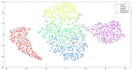 To gain insight into the classification abilities of the DBFD 2 model, the t-distributed stochastic neighbor embedding method (t-SNE) was used to visualize the network’s activations on the validation data set. t-SNE is one of the dimension compression algorithms used for the visualization of high-dimensional data. t-SNE works by creating a probability distribution that dictates the relationship between various neighboring points. It then recreates a low dimensional space that follows the probability distribution of the data as much as possible [30]. Visualization allows the finding of points that appear in the wrong cluster, indicating an observation that the network misclassified. 1350 data from each condition were compressed into a two-dimensional map and visualized. Tight clusters in the t-SNE plot indicate classes that the model classifies correctly, and outliers show misclassified data. From Figure 8, the early layer conv1 and maxpool1 activations do not exhibit any clustering by class because the layers were operating on low-level features. At conv2 and maxpool2 activations, the normal condition had already started to form clusters, which indicates the model was able to extract important features from the waveform early on. At these layers, the clustering of classes began to form, but not vividly, as there were overlapping data. At FC1 activations, normal, defective, high pressure, and misdirection had formed tight clusters, but the abrasion cluster was not well defined, as there were many overlaps between abrasion–high pressure and abrasion–defective. In the softmax layer, high-level features were extracted from the data. At this layer, the normal, defective, and misdirection classes were well defined, but the normal and high-pressure classes were not as tight, and were circular compared to the previous layer, FC1, because t-SNE tends to expand dense clusters and contracts sparse ones as a way of evening out cluster sizes. The results indicate that a shallow and compact 1D CNN model is capable of high-level feature learning.