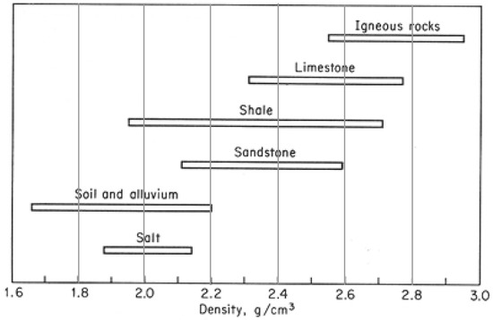 There are three main rock types, namely: igneous, metamorphic, and sedimentary rocks. The exploration and excavation of igneous and metamorphic rocks are termed hard rock activities, due to the rocks’ metalliferous mineral content, making them generally harder than sedimentary rocks which contain oil, natural gas, or coal. The exploration and excavation activity within sedimentary rocks is termed soft rock mining. Limestone and shale are sedimentary rocks; granite and gneiss are igneous and metamorphic (crystalline) rocks. Calcite and marble are found in limestone and are also significantly hard, as is quartz in sandstone. These are outliers in soft rock mining. Figure 1 shows the densities of different rock types, with increasing hardness on the y-axis.