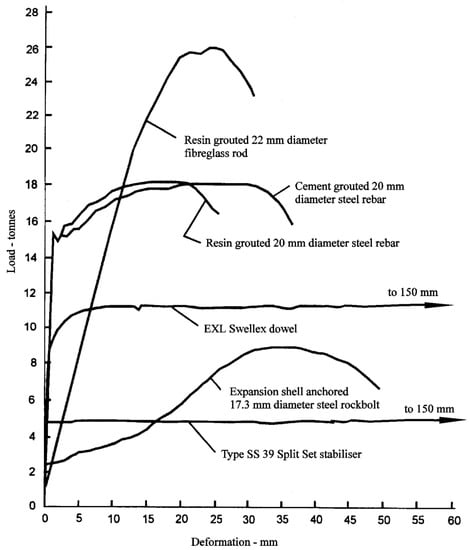 Test blocks of highly reinforced concrete were created in order to investigate the load deformation characteristics of available rock bolts used in the mining industry.The test blocks had a uniaxial compressive force of 60 MPa. Various rock bolts were installed inside the test blocks, following the standard instructions for installation used undergroud [15]. The load–deformation characteristics are show in Figure 6 were as follows: