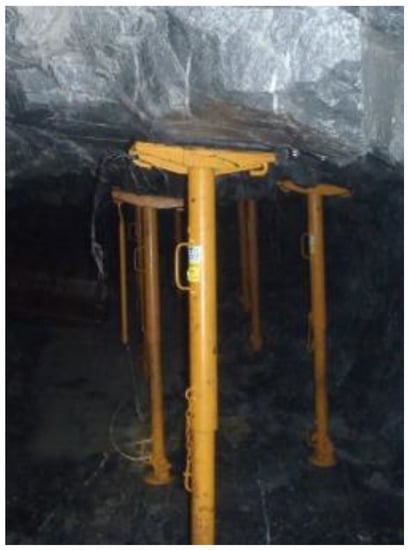 The Elbroc Omni prop and the Mine Support Products (MSP) Rocprops are shown in Figure 11. Both these props are manufactured in Johanessburg, South Africa, Elbroc and MSP are their respective manufacturers. The figure shows MSP props installed underground as permanent supports, with a high yield tonnage, pre-stressed using highly pressurized water and air. The Elbroc Omni prop has similar structural and performance qualities to the MSP prop. However, it contains a hydraulic pressure release valve which allows it to be reusable if no yielding has occurred. During static yielding, the props yield consistently at 20 tons, which is acceptable. A slight drop of 2 tons is periodically experienced during dynamic yielding [23]. The rock bolts should be installed in a row between props to decrease the spaces between supports. The yield behavior of the rock bolt and the props is the same.