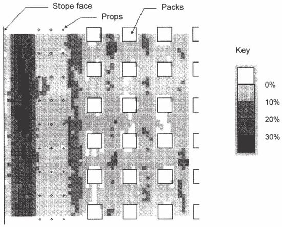All the current rock reinforcements discussed in Section 2.2 and Section 2.3 must be installed evenly at equal distances. This proves to be a difficult task due to the unevenness of the terrain. Installed props and packs greatly hinder the working space for machinery and personnel and lower the chances of evacuating mine workers in case of danger. The authors in [25] provide a means of simulating the probability of a rockfall between supports and of the failure of the support props and packs when evenly spaced (Figure 12). The support consists of three rows of permanent high-yield-tonnage (20 tons) props adequately installed, spaced 1 m apart down the face in rows 2 m apart. The first row of props is 3 m from the face. The back-area support consists of mat packs spaced 3 m × 3 m apart. The supporting effect of the blasting face where retrieval of mineral ores takes place is clearly shown. The probability of failure in the blasting area is lower near the blasting face due to the solid rock that still needs to be blasted. The support props are 3 m from the blasting face; this results in a probability of failure of 40% between the blasting face and the line of support props. Between the rows of props, the probability is generally less than 10%. The probability of failure increases to values of between 10% and 20% between the packs. The effect of the 2 m gap between the last row of props and the packs results in a probability of failure between 10% and 20%. In Figure 12, a hanging wall is the roof above miners as the travel to a producing stope face.