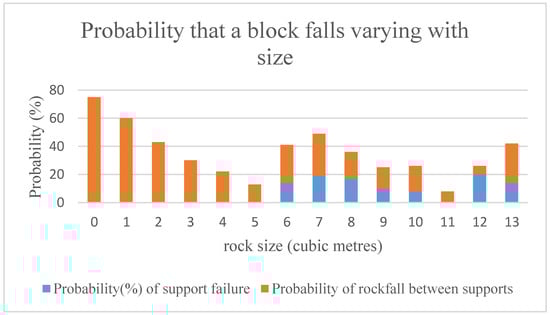 Figure 13 shows a bar graph of the probability of a rockfall between supports, showing the probability of a rockfall due to support failure against rock sizes. Rocprops are recommended to be installed 1.5 m apart in both width and breadth in a hanging wall. The height of the hanging wall varies by up to 6 m. We assumed a hanging wall height of 2.5 m in the following analysis.