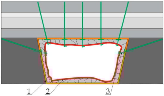 The biggest possible rockfall between two adjacent supports would have a volume of 1.5 m × 1.5 m × 2.5 m = 5.63 m3 and has a probability of occurrence of 13%, as shown in Figure 13. By installing yield bolts halfway between the lines of Rocprops, the possible size of rockfalls between supports reduces to 0.75 m × 0.75 m × 2.5 m = 1.41 m3, with a probability of occurring of 60%. Furthermore, these rockfalls are less likely to be fatal [25].