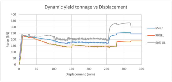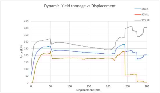Figure 25 shows the mean yield tonnage against the cone’s displacement during dynamic testing of the improved rock bolt design. A 90% standard deviation for the upper and lower limit is also shown. The standard deviations are shown to predict the best- and worst-case scenarios of the performance of the rock bolt following the quality tolerance of the materials used. The lower limit standard deviation shows an average of 18 tons, which is an acceptable yield tonnage in the event of a poor-quality batch of materials.