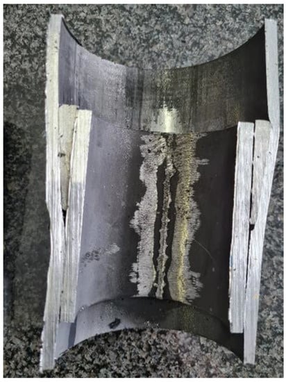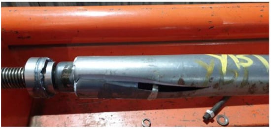 Figure 28 shows a cross-sectional view of the cone with the inner tube and outer tube, providing evidence of the misaligned cone. To prevent misalignments of the inner tube during operation underground, the length of the inner guide tube was increased in the improved design. Furthermore, due to the failure mode of test 3, the wire rope used to pre-stress the yield bolt underground began to fail, as shown in Figure 29.