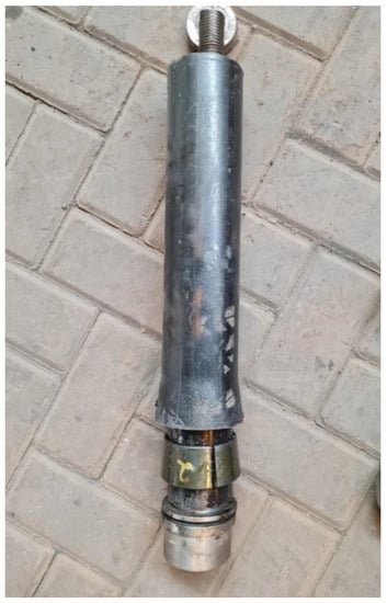 The Timrite pencil prop, a timber-based permanent support, uses a jackpot for pre-stressing and has high yield tonnage, with no possibility of adjusting the height of the prop (Figure 10). The props are of a fixed height, with slight variations in height as the roof underground is uneven. It is difficult find the exact height required for the pencil prop and to install the props in a sufficiently pre-stressed state. During dynamic testing, the wood fibers split, resulting in an immediate drop in the dynamic-load-bearing capability [22].