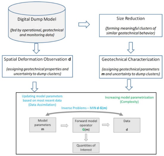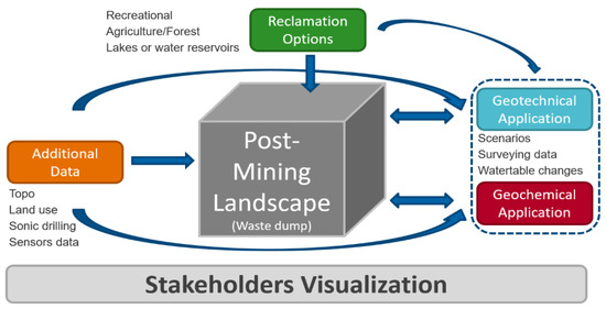 Spatially and temporally, very dense data and information for both the geotechnical and geochemical attributes of coal waste dumps are available and can be effectively used. Examples include active and passive satellite sensors [,]; airborne and terrestrial LIDAR (data for areal information) [,]; geochemical and mineralogical point sensor data including Infrared (IR) spectroscopy [,]; classical surveying data; and self-sufficient deformation sensors for local information. Many operations already continuously scan the dump during construction using laser-scanning technology []. Additionally, recent research and technical developments have resulted in process simulators and material-tracking systems that allow the creation of a digital spatial dump model, capturing the spatial location of the material being placed inside the dump body at the time of dumping []. This enables the classification and location of dump areas with particular material characteristics and related heterogeneity as one major impact factor for time-related geodynamical processes. Last, but not least, data from standard hydrological and geotechnical monitoring and modeling, such as the monitoring of wells or Cone Penetrating Test (CPT) measurements, within the waste dumps provides related information. As a consequence, for improved and scientifically sound post-mine-use planning, the following questions can be addressed: