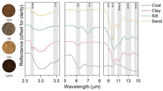 Based on legacy data, the Schleenhain and Peres mine fields can be roughly separated into four lithologies: coal, claystone, sandstone, and siltstone. The expected dominant minerals in these lithologies are lignite coal, quartz in the sand fraction, and kaolinite and muscovite in the clay and silt fractions. Using spectral libraries [] it was possible to determine the spectral bands and wavelengths of the minerals in the provided suite of samples. Every lithology was identified using the spectral features of their minerals and mineral mixtures (Figure 2).