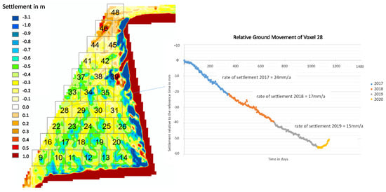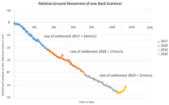 Unlike the Sentinel 1 Sensor, the TerraSAR-X data resulted in good spatial coverage across the study area with approximately 57 back-scatterers per ha. Additionally, the precision of data was independently checked and was evaluated with a movement rate of approximately ±2 mm/a. An example of a resulting time series is provided in Figure 3.