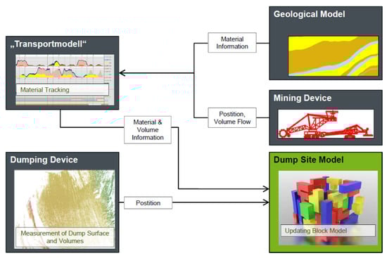 The basis of geotechnical analysis is formed using a digital dump model. This is created through the interaction of various components, including the geological model of the excavation site, a material-tracking system that translates the position of material from the excavation site to the dump site, and real-time measurements on mining and dumping devices using laser scanning. Figure 5 shows the scheme for generating the dump-site model.