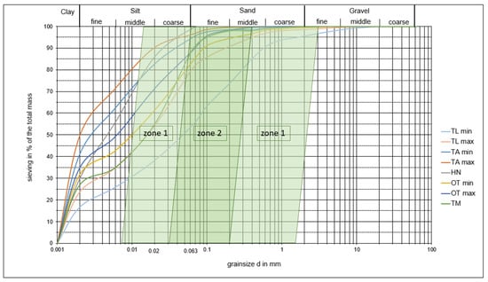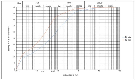 Liquefaction: The term liquefaction refers to a mechanism in which a sandy soil suddenly loses its shear strength and behaves like a liquid. The structure of the water-saturated sand collapses and the pore water pressure temporarily increases []. The following boundary conditions are required for such behavior: water-saturated soil, loose density (porosity n > 40%), effective grain size d10 ≈ 0.1 mm, coefficient of uniformity Cu < 5, low adhesion between the grains, low cohesive bonding, poor drainage related to pore water and air, and round grain shape.