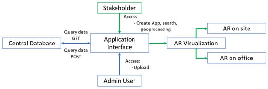 Once the user is authenticated and granted entry to the application, the browser window will display the contents. Depending on the access rights of the user, different contents will be available, including the main tabs: “Dashboard”, “Search”, “Upload” and “Create App”. The first will display the main information and description regarding the accessing account, while the “Search” option allows the user to search entries depending on the required necessities/interests, plus the additional option of applying filters. Besides this, the third option (“Upload”), permits the uploading of files to the database and will only permit certain extensions and sizes to be selected. These files may be, for instance, information required for model calculation, new measurements taken in the field, etc. Once the user confirms the selection, metadata will be extracted and displayed before the file is sent to the database. Finally, the option “Create App” creates a new connection with ArcGIS services [] to display the current information within the database; this can include maps, the location of drill holes, and models, among others. The display of such information is to be performed with 3D capabilities, and will allow the models to be checked before dispatching anything to the AR applications.