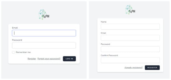 The application is constructed with an authentication filter that all users will see when they try to access the url address. This is shown in Figure 16, where either the user is required to log in with their credentials (first window shown) or they are given the option of registering. This will allow the application to review the rights of the accessing individual, in order to differentiate between administrative rights and simple rights. All credentials are to be saved in the main database created for the application. Further inbuilt characteristics allow the recovery and changing of the password. On the other hand, if authentication fails, access to the information will be denied.