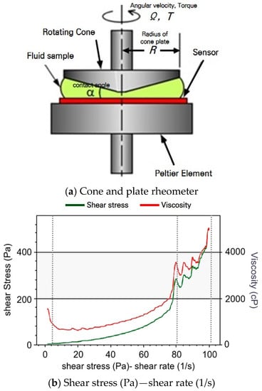 The rheological tests were performed using a rheometer (Anton-Paar MCR301), and the STF samples were placed between a cone plate and the foundation support of the rheometer. The shear rate applied to the sample was raised from 0 to 100 s−1 during the experiments, and all the tests were conducted at a room temperature of 25 °C. Figure 2a,b show the schematic of the rheometer and rheological test results of the STF-based stemming material, respectively.