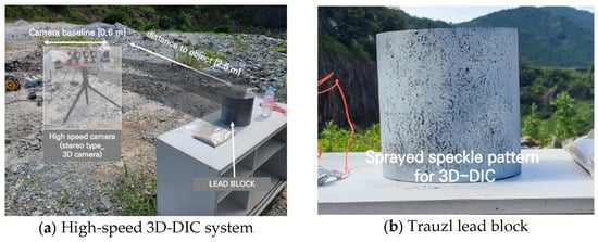 In this study, to measure the dynamic expansion process after the blasting of the lead block, two APX RS high-speed cameras manufactured by Photron were set up at 12,000 fps, as presented in Figure 6a. The distance to the lead block was 2.5 m, the distance between the two cameras was 1.0 m, and the entire area of the region of interest (ROI) for the image correlation was set at 860 × 860 mm2. To use the recording speed of 12,000 fps, an effective pixel area of only 512 × 384 pixels was used, compared to the actual measurement area of 430 × 322 mm2. Table 2 provides a comparison of 2D/3D digital image correlation techniques.