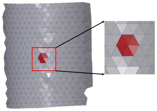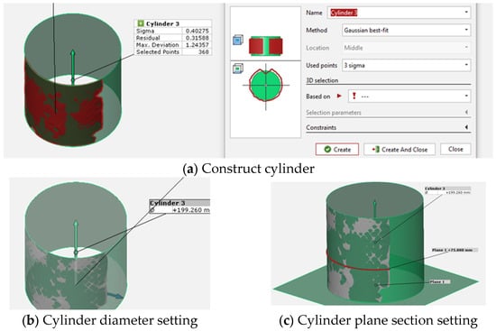 As shown in Figure 8a, 368 data points were measured using a 3D-DIC system; these points were formed into a lead cylinder using a Gaussian best-fit technique to determine its diameter and cross-section. Figure 8b shows the process of forming the diameter and the cross-section near the chamber, starting from the lower surface of the test piece. The 3D-DIC technique identifies a random pattern created on the sample surface to measure the displacement. The strain is calculated by differentiating the displacement of the node element used in finite element analysis (FEM) and can be measured by the displacement of the entire region of the sample. In this experiment, a node element was created to calculate the strain, as shown in Figure 9.