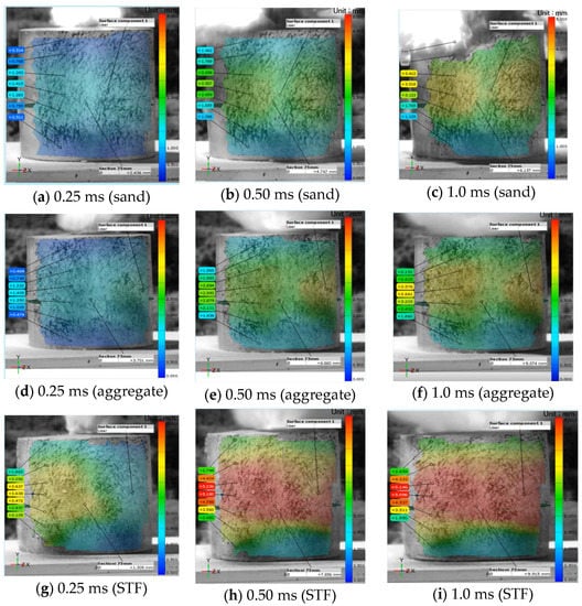 The initial volume of the lead block blast hole before the explosive charge detonation was measured to be 72–74 cm3, and the average expansion rate of the lead block after the explosion, i.e., the average Trauzl number, of the STF-based blasting stemming material was 7.12, higher than that of the fine aggregate (6.77) and sand (6.03). After estimating the blasting stemming effect of the STF-based stemming material based on the lead block expansion of the sand, the STF-based stemming material showed a stemming effect approximately 18% higher than that of sand. Table 6 shows the displacements of each designated point on the lead block surface measured using the 3D-DIC system, and these are the initial displacement data between the detonation of the explosive charge and the maximum expansion point of the lead block.