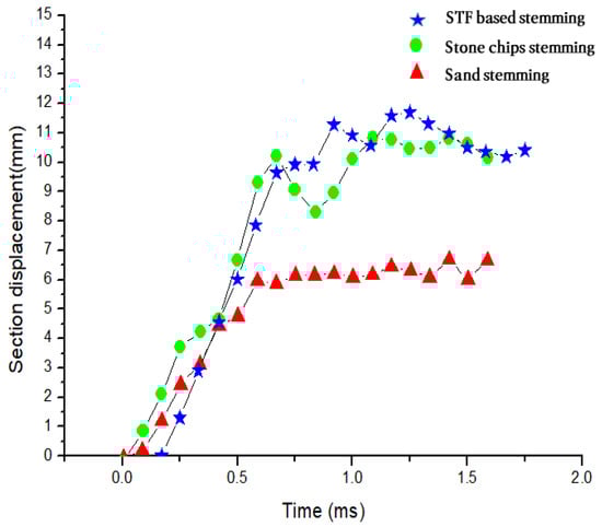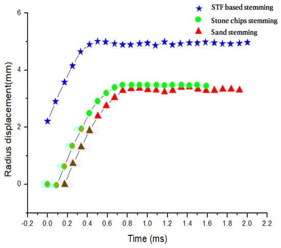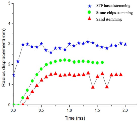 Figure 11 shows the change in the expansion of the lead block over time. For the cross-sectional displacement on the surface of the explosive chamber where the explosive charges are detonated, the STF stemming material showed approximately 1.6 times higher displacement compared to the sand at each time point, in addition to a slightly higher level of displacement compared with the fine aggregate (Figure 12). Figure 13 presents the average values of the displacements at points 3, 4, and 5 among the measurement points arranged in parallel on the lead block blast hole, and the STF stemming material showed a clearly higher radial displacement compared with that of sand and fine aggregate.