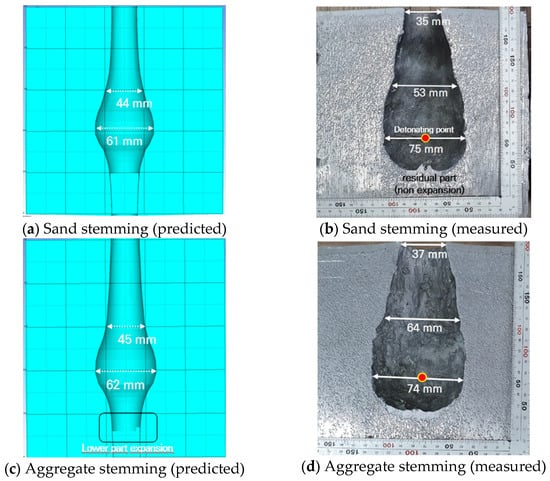 Figure 20 shows the comparative results of the Trauzl test and numerical analysis. Although there were some differences between numerical analysis and real experiments, the trends according to stemming materials were similar. The reason why the experimental and numerical analysis results are different is that the frictional resistance between the stemming part and blast hole wall was not considered in the numerical analysis, and the gas flow was not reflected in the analysis in detail.