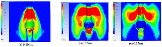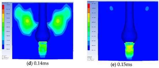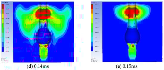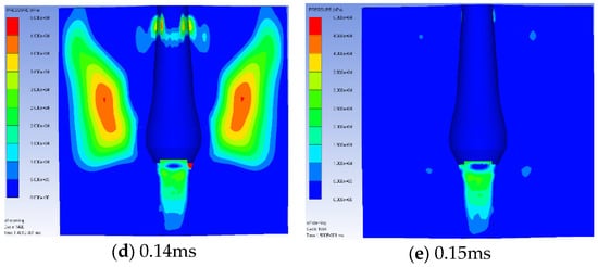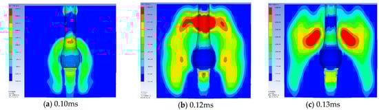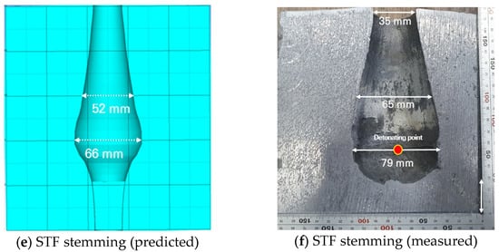Figure 15 presents the expansion shape of the lead block blast hole with sand, fine aggregate, and STF stemming based on the experimental results and numerical analysis results. Clearly, the STF stemming resulted in the largest expansion diameter and showed additional expansion at the bottom of the blast hole. Figure 16, Figure 17 and Figure 18 show the initial pressure distribution within the range of 0.1 to 0.15 ms after detonation. The pressure range in the left-hand figures ranged from 0 to 50 MPa. The pressure contour of the STF stemming was larger than that of the sand and fine aggregate.