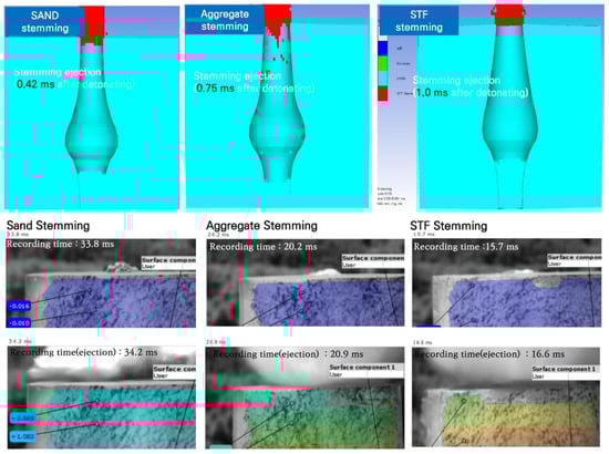 Figure 19 shows a comparison of ejection times of the stemming materials. The ejection times for the sand and fine aggregate stemming were 0.45 ms (test result: 0.4 ms) and 0.75 ms (test result: 0.7 ms), respectively. The total ejection time of the STF stemming was 1.0 ms (test result: 0.9 ms), which indicated a significantly high ejection resistance concerning the blast borehole pressure. Hence, the STF stemming material has superior sealing capacity compared to general stemming materials such as sand and aggregate